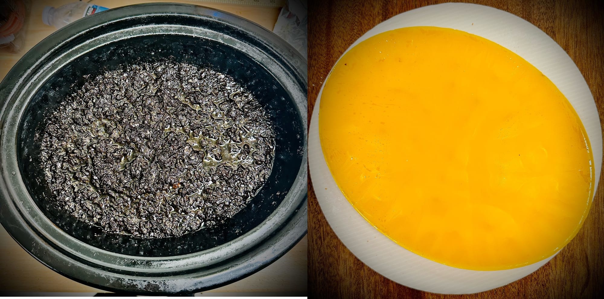 But wax is a precious commodity for a beekeeper as well. We use it for things like lip balm, soap and candles. We must not let the wax go to waste. And believe it or not, even the dirtiest wax can be redeemed. Wax that appears to be ruined can be rendered to remove all the impurities through a repeated process of heating and filtering and then letting it solidify. The clean wax rises to the top and all the impurities fall to the bottom. After several cycles, the wax is clean and ready to be used for other products of the hive. In the end, the rendered wax takes on its famous golden yellow color.