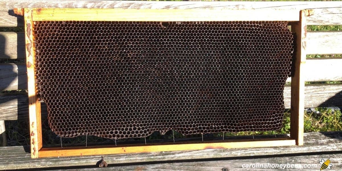But over time, this beautiful white wax darkens in color. How does that happen you ask? Well, just imagine what your new white carpet would like if no one ever wiped their feet at the door after spending the day playing in the garden. Because that's what bees basically do. They not only bounce from flower to flower, but foraging bees also walk on the ground and meander through the mud as they work their way to a puddle of water. And when they return home, those silly little creatures always forget to wipe their feet at the door before entering the hive.